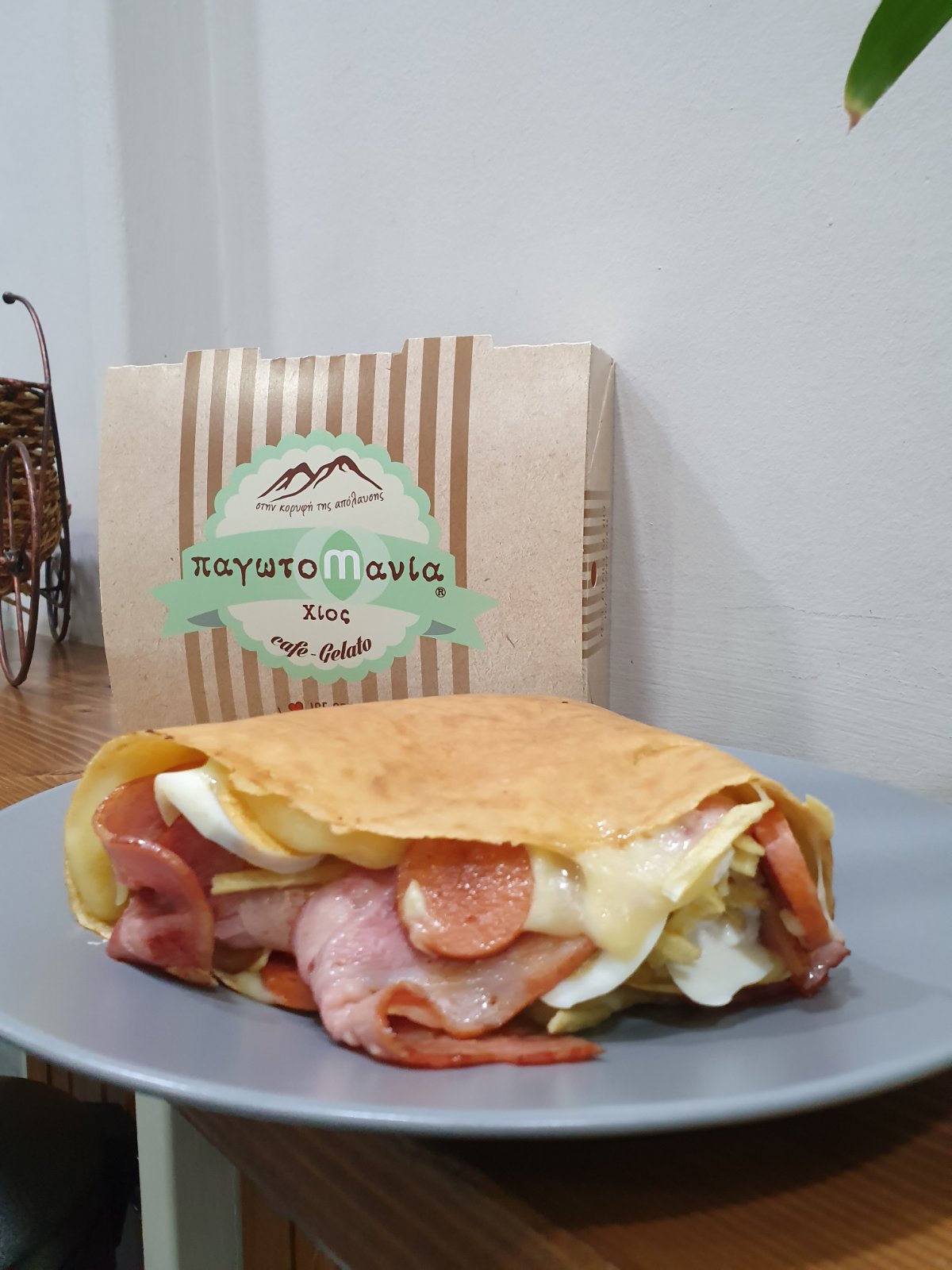 17) Burger : Κρέπα Αλμυρή με τυρί, μπιφτέκι, μπέικον ντομάτα, iceberg, πατατάκια, σως μουστάρδας