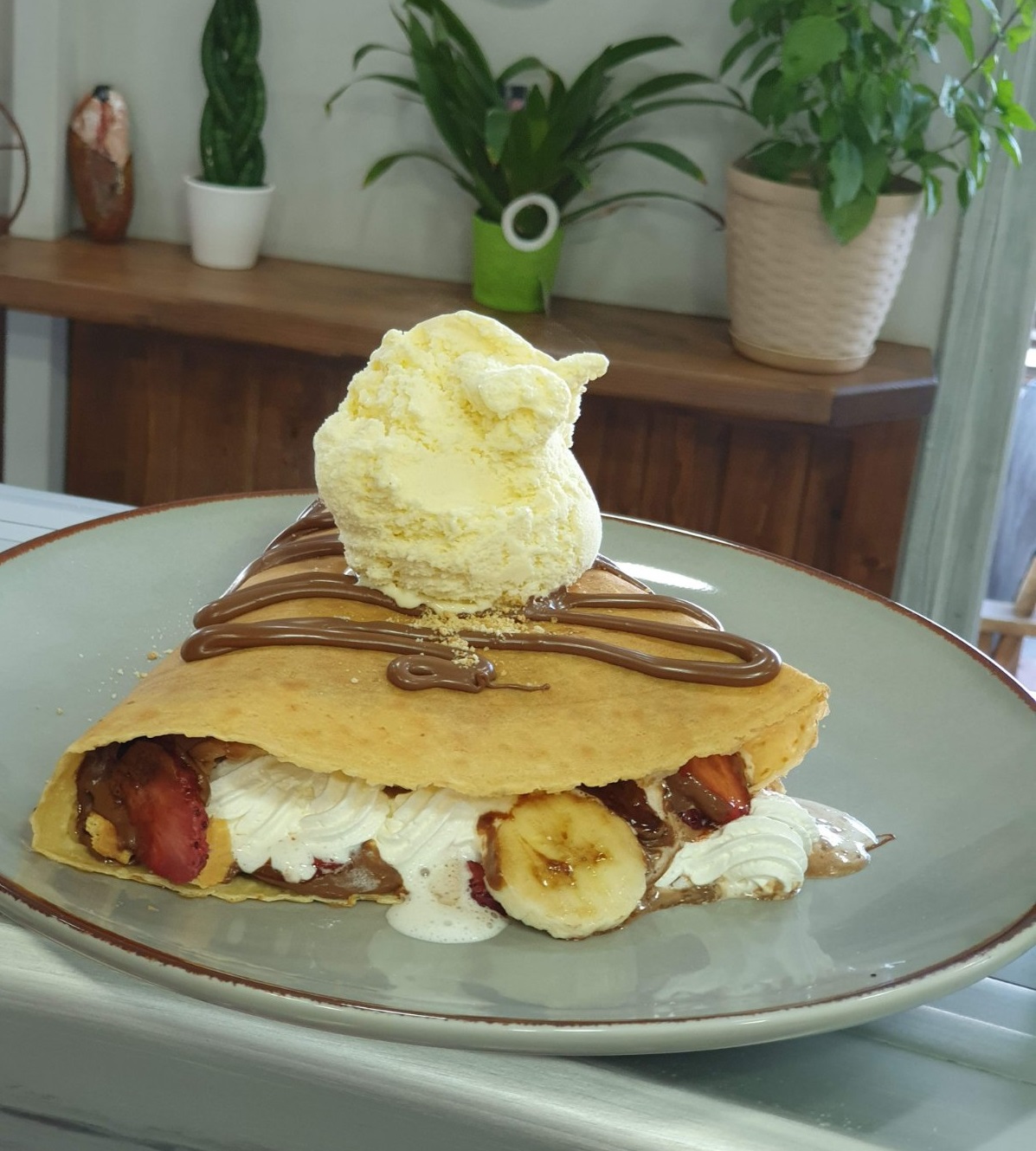 Μερέντα, παγωτό βανίλια Μαδαγασκάρης, μπισκότο Πτι-μπερ, φρούτο (φράουλα & μπανάνα), σαντιγί, σιρόπι σοκολάτα | Merenda, ice cream vanilla Madagascar biscuit, fruit (strawberry and banana), whipped cream, chocolate syrup